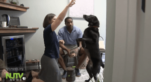 Five-year-old Katie happily takes treats from her parents. They’ll celebrating because the lab mix is now cancer free.